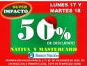 Lunes, 17 y martes 18, 50% de descuento en tu compras con tarjetas de crédito Nativa Mastercard del Banco Nación, en Súper Impacto, Sarmiento 819, Saladas – Corrientes ..