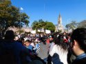 La historia se repite: En la fría siesta de este jueves, tutores, alumnos y docentes se manifiestan pacíficamente con pancartas y banderas, por Av. Leyes, frente a la Escuela “Gíudice”, reclamando la construcción de un nuevo edificio escolar, debido a la falta de aulas, para el dictado de clases. ..
