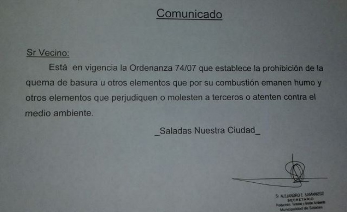 La Municipalidad de la ciudad de Saladas, a través de un comunicado de la Secretaría de Producción, Turismo y Medio Ambiente, que lleva la firma de su titular Sr Alejandro Efraín Samaniego, recuerda a la población que está prohibido realizar quemas de todo tipo de residuos en la ciudad, ya sea en la vía pública como también en domicilios particulares y todo otro espacio abierto dentro del ejido de la ciudad de Saladas.