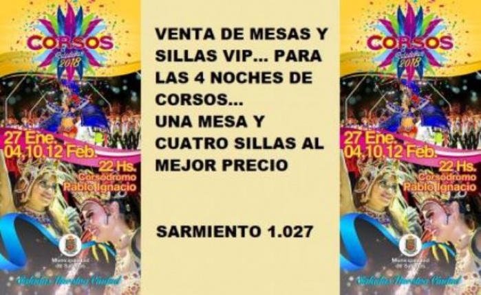 La Comparsa NEW PORA, adjudicataria del Concurso de Precios para venta de sillas y mesas en los Corsos oficiales de Saladas, puso un puesto de ventas ubicado en Sarmiento 1027 (entre Cnel. Leyes y San Martin) de esta ciudad, donde ya se pueden adquirir espacios VIP, para las cuatro noches de Corsos, con diferencia de valores en 1ra., 2da. o 3ra fila de mesas y sillas.