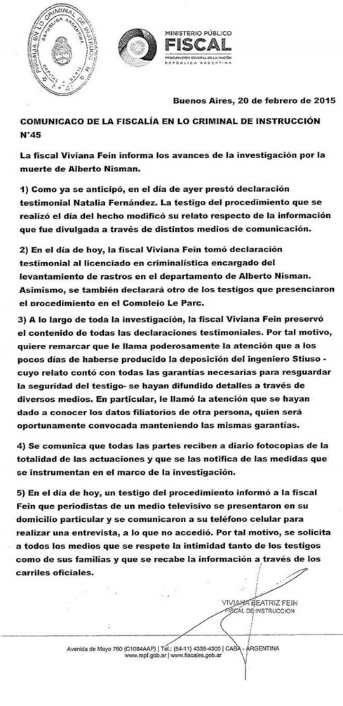 Por DARIO RAMBAU Especial para Misaladas - Ayer declaró Natalia Fernández, testigo en la causa Nissman, ante la Fiscal Fein. Esta produjo la convocatoria para que ratifique o rectifique sus dichos ante Clarín, unos días antes, donde relataba una serie de irregularidades que se habrían producido en el procedimiento realizado en el Dpto del Fiscal Nisman el día que lo encontraron muerto.