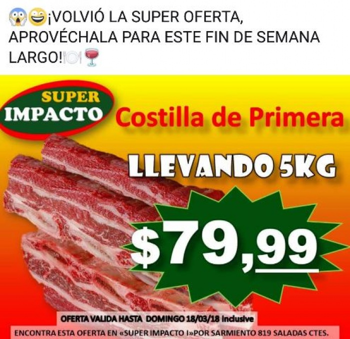 {{Pero si algo hacía falta era un buen asado a un precio espectacular, lo conseguís a solo $79,99 el kg., adquiriendo 5kg, ¿dónde lo encontrás?... en: “Súper Impacto”, sito en calle Sarmiento 819 de nuestra ciudad, la oferta es válida hasta el domingo 19 de marzo, inclusive}}