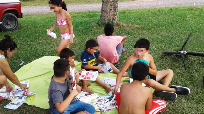 Niños del barrio “50 Viviendas Itati” con entusiasmo preparan decoraciones para saludar a los competidores de la primera fecha del Campeonato Correntino de MTB , que se correrá mañana domingo 18 en Saladas.