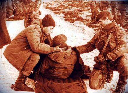 Imagen emotiva. En cuclillas, ayudando a un camarada herido del RIM 4, vemos al Granadero Miguel Angel Piaggio. Observándolos armado, un inglés...