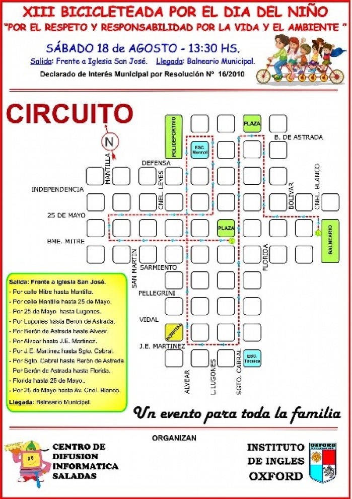 En el marco del mes del niño y organizado conjuntamente por el Centro de Difusión Informática Saladas (CDIS) y el Instituto de Ingles Oxford, este sábado 18 de agosto, por decimotercer año consecutivo se llevará a cabo una Bicicleteada, constituyéndose en una actividad tradicional, ya arraigada en la comunidad saladeña.