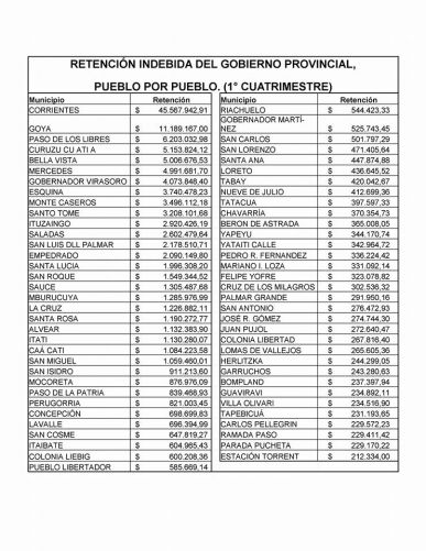 A la Capital, según muestra la planilla localidad por localidad, el gobierno de Ricardo Colombi retuvo a la Capital 45 millones, a Goya más de 11, a Paso de los Libres más de 6, en el caso de Mercedes casi 5 millones.
