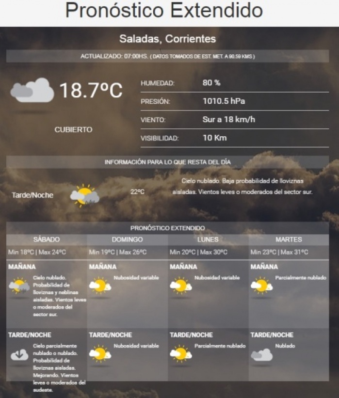 El domingo finalmente el sol le ganará a las nubes y se espera una jornada con muy buen tiempo en la ciudad de Saladas La temperatura máxima llegaría a 28ºC, según el informe del SMN.