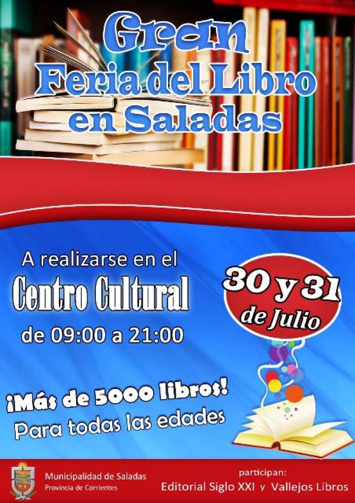 La primera Feria del Libro de Saladas es auspiciada por la Municipalidad de Saladas y se realizará los días 30 y 31 de julio, en el horario de 09:00 a 21:00hs., en el Centro Cultural “Sargento Juan Bautista Cabral” sito en 25 de Mayo y Sargento Cabral de la ciudad de Saladas.