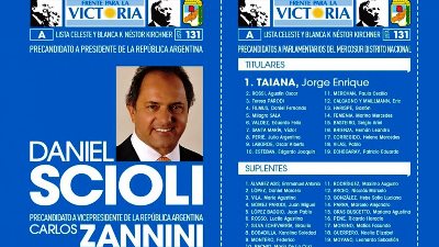 Según la presentación realizada ante la Justicia Electoral, el binomio que encabeza Daniel Scioli junto a Carlos Zannini será la Lista Celeste y Blanca Néstor Kirchner A 131, y fue oficializada por uno de sus apoderados, Juan Pablo Álvarez Echagüe, subsecretario de la Jefatura de Gabinete bonaerense que encabeza Alberto Pérez.