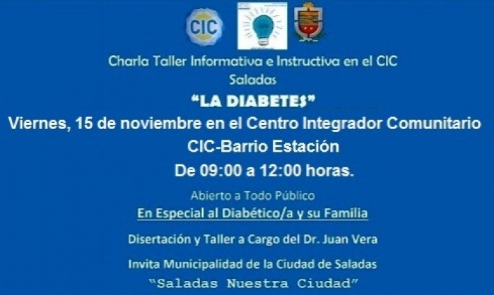 En este marco, la Municipalidad de la ciudad de Saladas, mediante los profesionales del Centro Integrador Comunitario (CIC), situado en barrio Estación, el viernes 15 de noviembre, en el horario de 09:00 a 12:00hs., llevará a cabo una “Charla Taller, Informativa e Instructiva”, sobre “La Diabetes”.