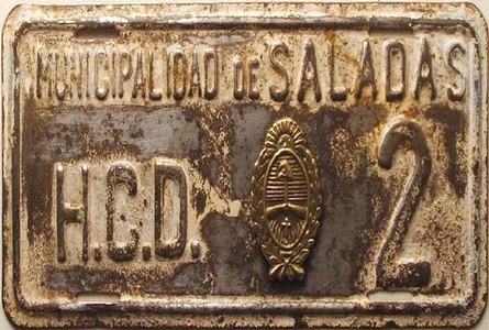 La última Ley Orgánica de Municipalidades que rigió al Municipio de Saladas fue la Nº 4752 (30/11/1993), suplantada por la Carta Orgánica Municipal en el año 2006, desde entonces Saladas dejo de tener Concejo Municipal, para pasar a poseer Concejo Deliberante, la chapa en cuestión da una evidente impresión de tener una antigüedad superior a la puesta en vigencia de la Carta Orgánica, pero se puede presumir como compatible a los años de validez del Decreto Nº 06769/1958, que fijaba el régimen municipal de la provincia de Corrientes.