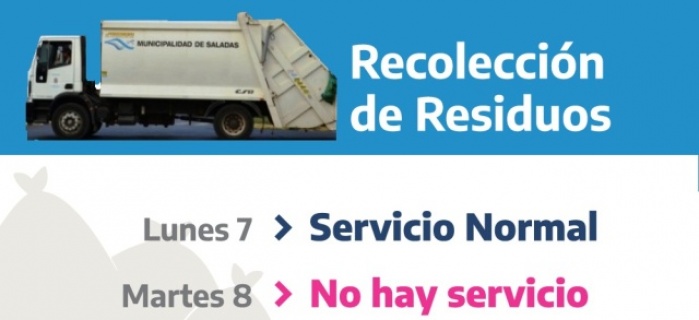 Desde la Municipalidad de Saladas informaron, que este lunes 7 de diciembre la recolección de residuos domiciliarios se realizará en forma normal, en todos los turnos e itinerarios habituales, en tanto el martes 8 no habrá servicio de recolección de residuos domiciliarios.