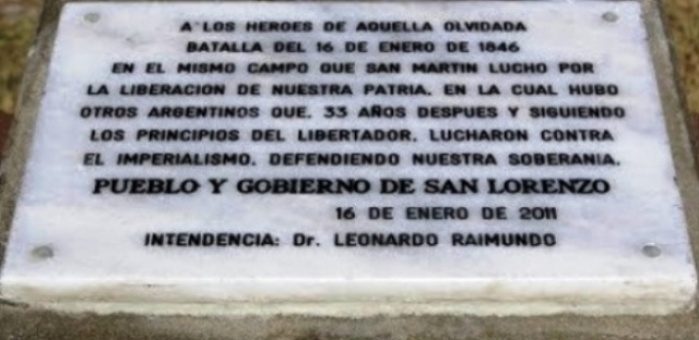 Segundo Combate de San Lorenzo: “A los héroes de aquella olvidada Batalla del 16 de enero de 1846, en el mismo Campo (de la Gloria) que San Martin lucho por la liberación de nuestra patria. En la cual hubo otros argentinos que 33 años después y siguiendo los principios del libertador, lucharon contra el imperialismo. Defendiendo nuestra soberanía”