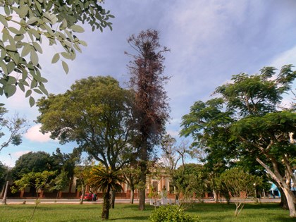 Un añoso pino de plaza Cabral de la ciudad de Saladas, habría (aparentemente) sufrido una descarga eléctrica originada por un rayo, siempre de acuerdo a la respuesta de uno de los encargados del mantenimiento de este paseo público, el pino luce totalmente seco como podrán apreciar en las imágenes de la galería fotográfica, en el enlace al pie de la nota.