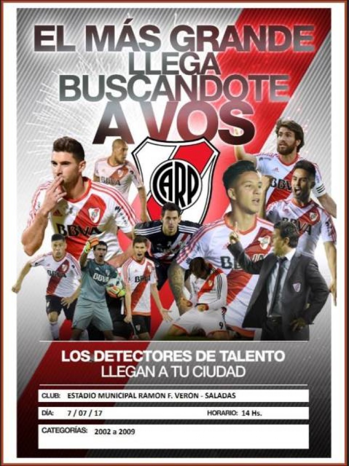 A través de su Dirección Deportiva Infanto Juvenil, el Club Atlético River Plate bajará a la ciudad este viernes 7 de julio desde las 14.00 horas, en busca de talentos para sus inferiores.